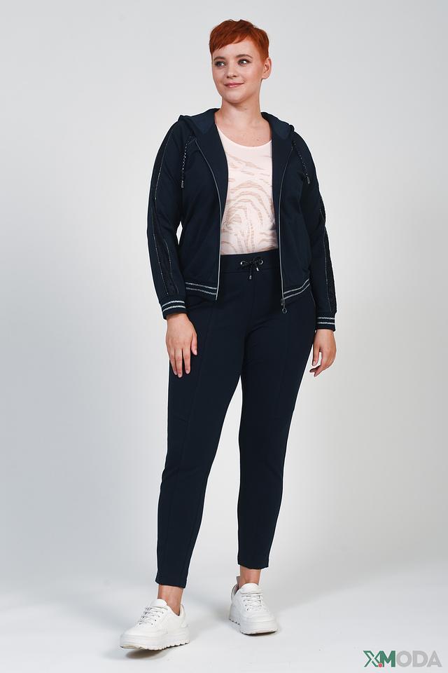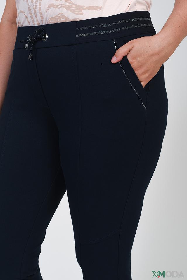 Брюки имеют удобный эластичный пояс с регулирующим шнурком, обеспечивающий комфортную посадку по фигуре. Декоративные вставки на передней части брюк добавляют им стильный акцент и визуально вытягивают силуэт.