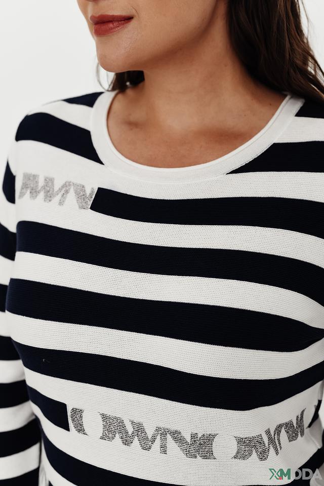 Особенностью модели является декоративная надпись, выполненная в виде блестящих букв, что придает изделию изысканность и оригинальность. Пуловер имеет удобный круглый вырез горловины и рукава три четверти, что делает его идеальным для создания повседневных образов.