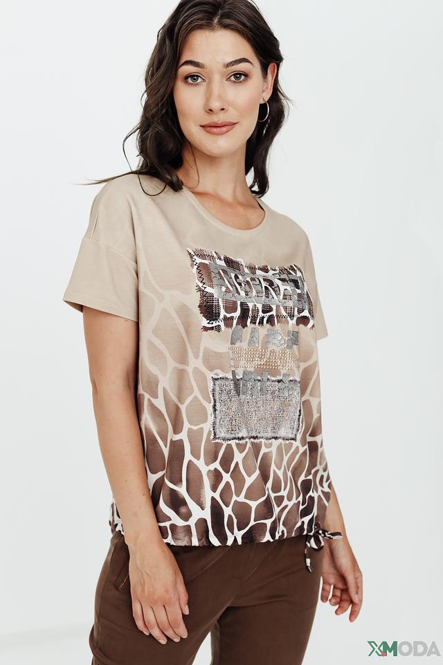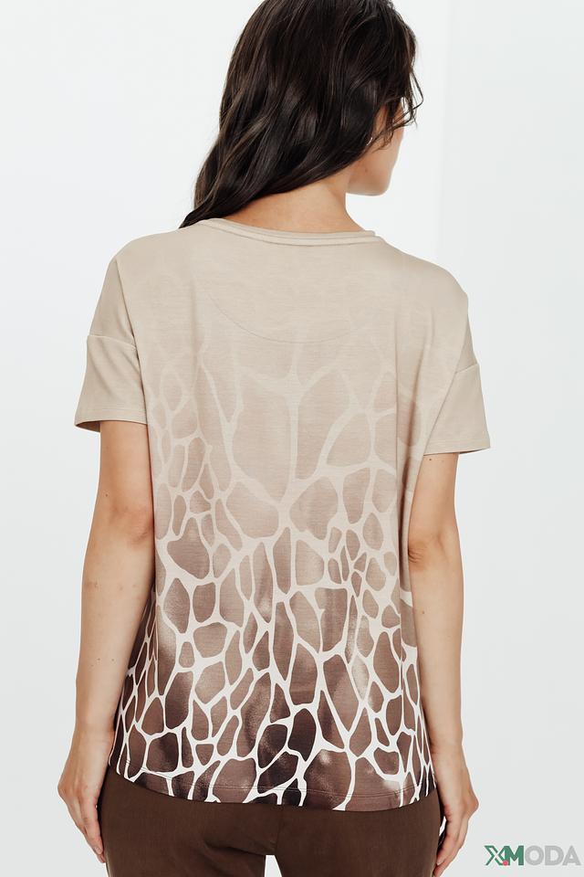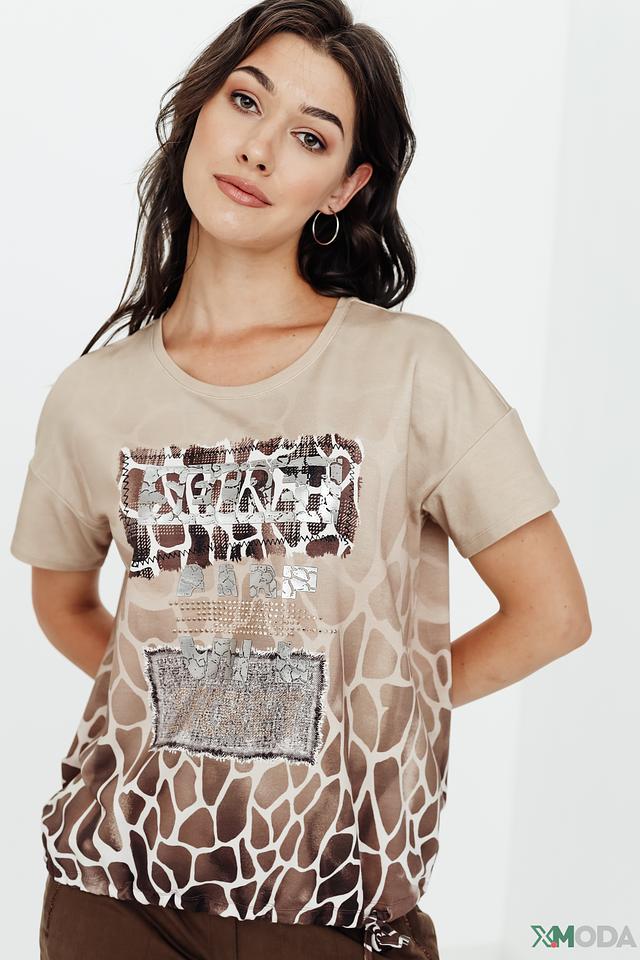 Бежевая блуза Thomas Rabe с оригинальным принтом в виде пятен жирафа и аппликацией. Модель свободного кроя с короткими рукавами станет отличным дополнением к вашему образу. Состав: хлопок 47%, модал 47%, эластан 6%
