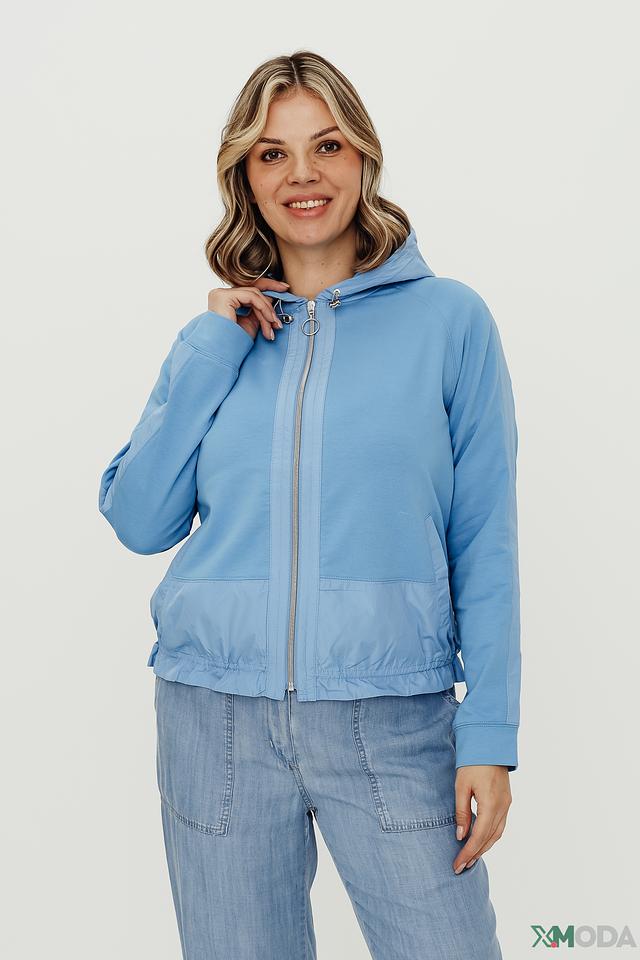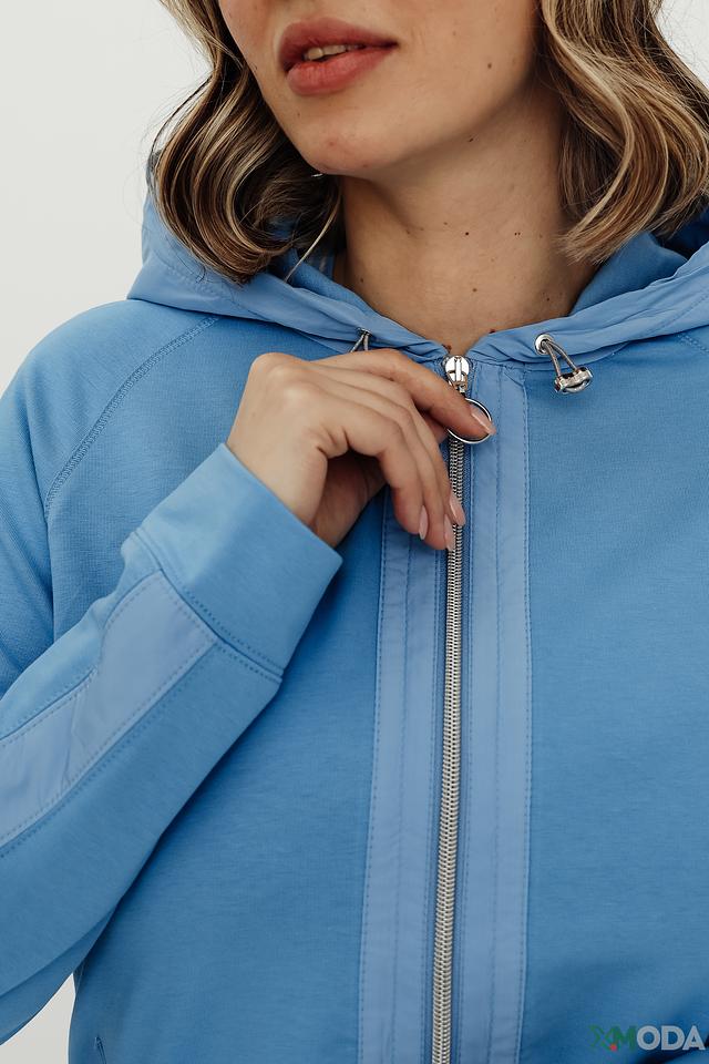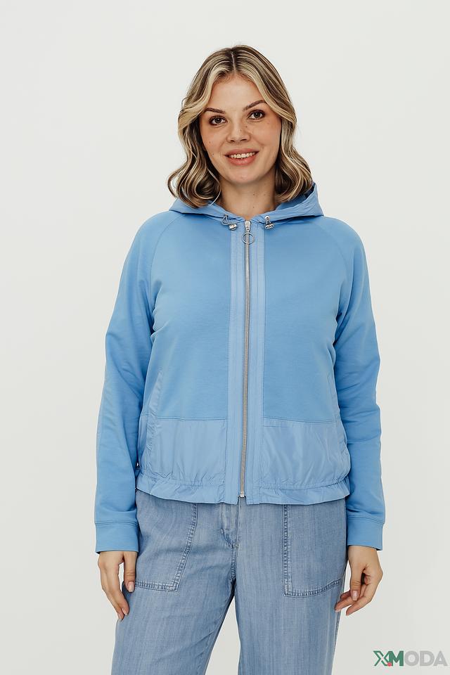 Женский жакет Thomas Rabe голубого цвета с капюшоном и застежкой-молнией. Модель выполнена из мягкой ткани с добавлением хлопка, полиэстера и эластана, обеспечивающих комфорт и свободу движений. Состав: хлопок 75%, полиэстер 15%, эластан 10%