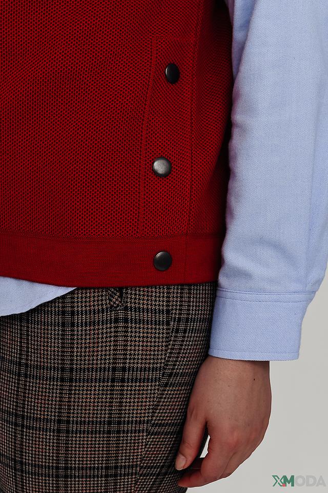 Жилет имеет насыщенный красный цвет и прямой крой. Воротник-стойка добавляет модели элегантности, а завязки на капюшоне позволяют регулировать посадку и создавать разные образы.