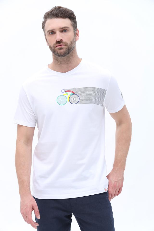Белая футболка Time Zone с оригинальным принтом в виде велосипеда. Изготовлена из 100% хлопка, обеспечивающего комфорт и воздухопроницаемость. Стильный и удобный вариант для повседневной носки. Состав: хлопок 100%