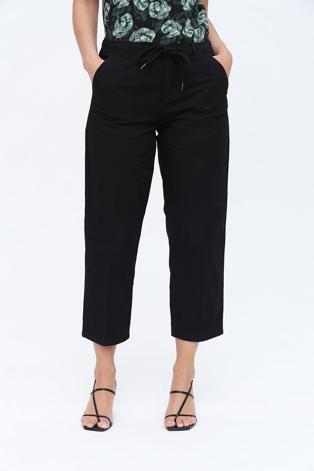 Чёрные брюки от Time Zone — это стильное и комфортное решение для повседневного гардероба. Модель выполнена из хлопка с добавлением эластана, что обеспечивает удобную посадку и свободу движений. Брюки имеют пояс на завязках и укороченный крой. Состав: хлопок 98%, эластан 2%