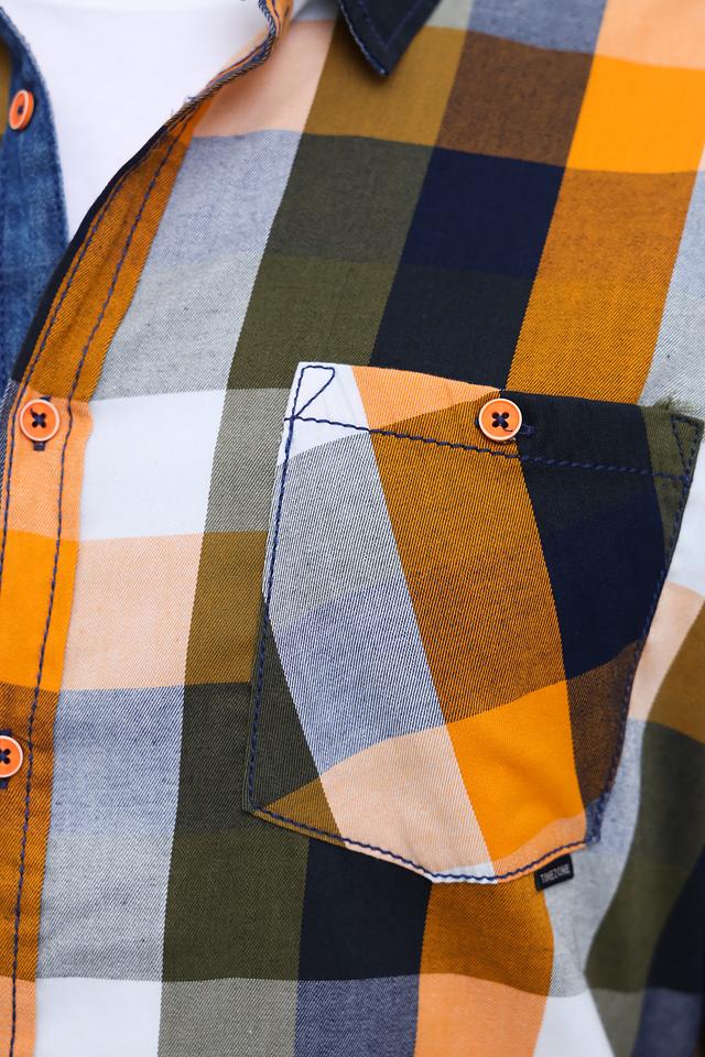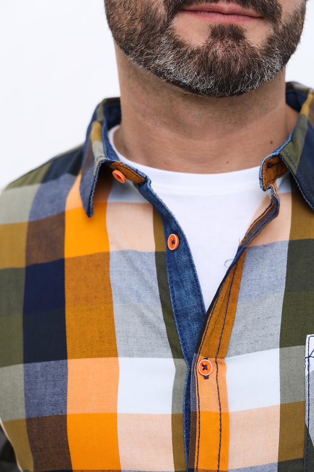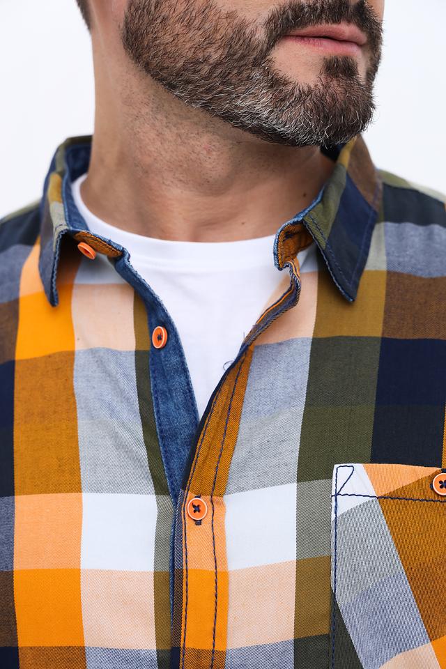 Рубашка имеет классический крой с длинными рукавами и стандартной посадкой. Особенностью модели является яркий клетчатый принт, сочетающий в себе оранжевые, зелёные, синие и белые тона. На груди расположен накладной карман с аккуратной отделкой.