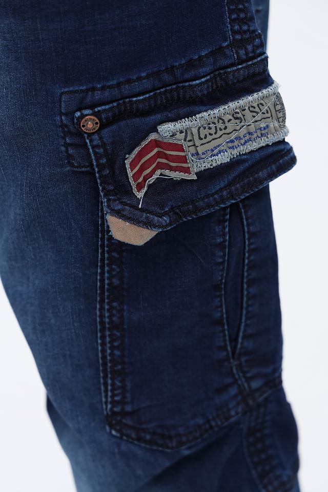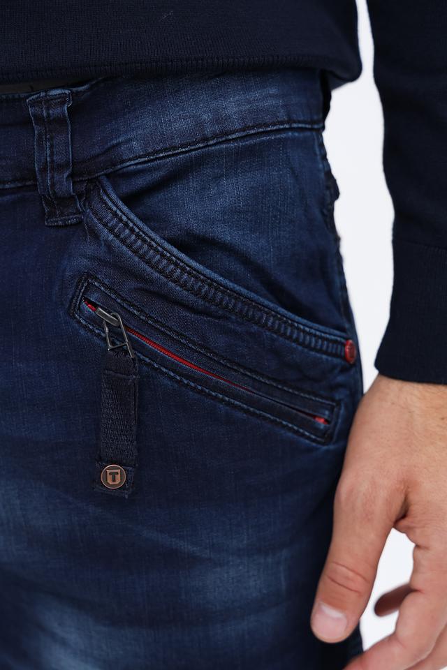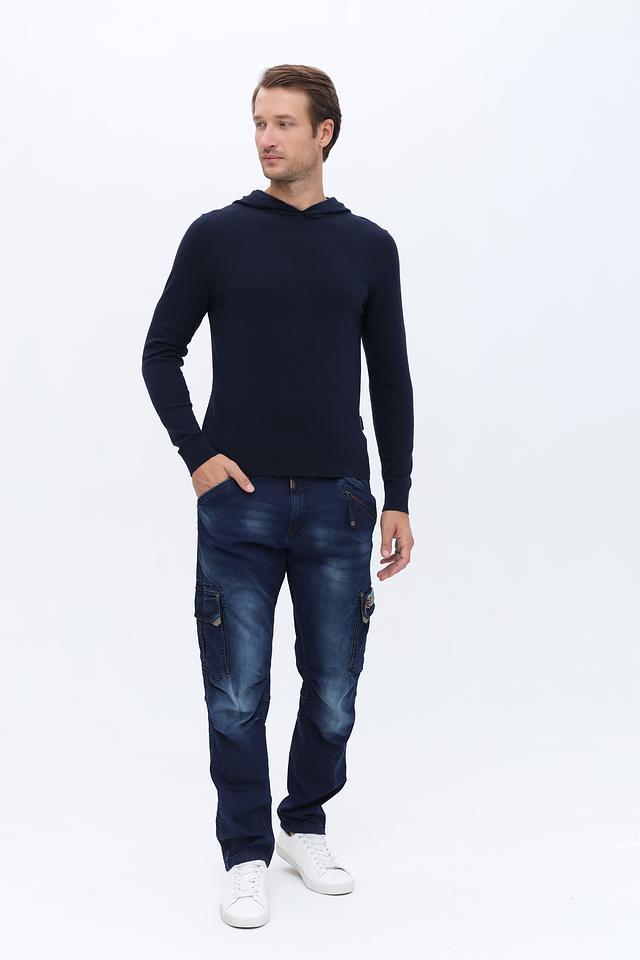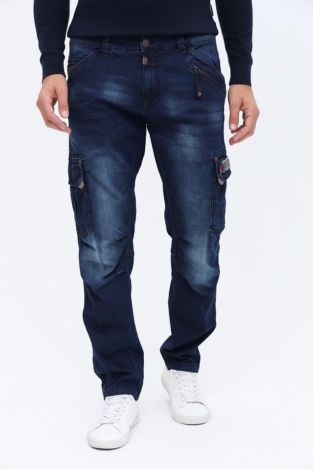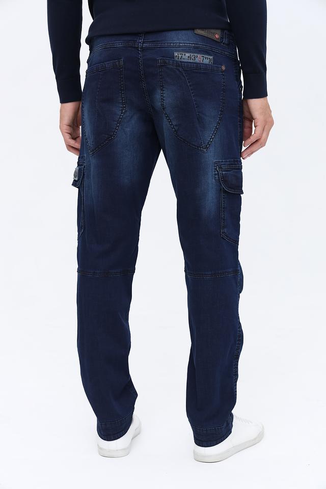 Мужские джинсы Time Zone тёмно-синего цвета в стиле карго с удобным кроем и функциональными карманами. Модель отличается стильным дизайном с эффектом потёртости и декоративными элементами. Состав: хлопок 99%, эластан 1%