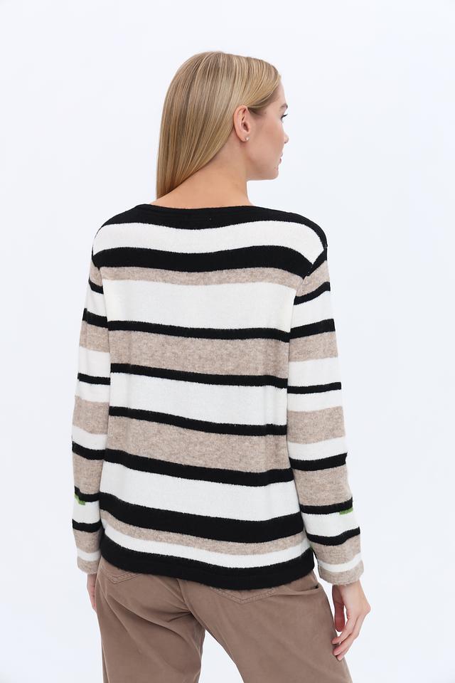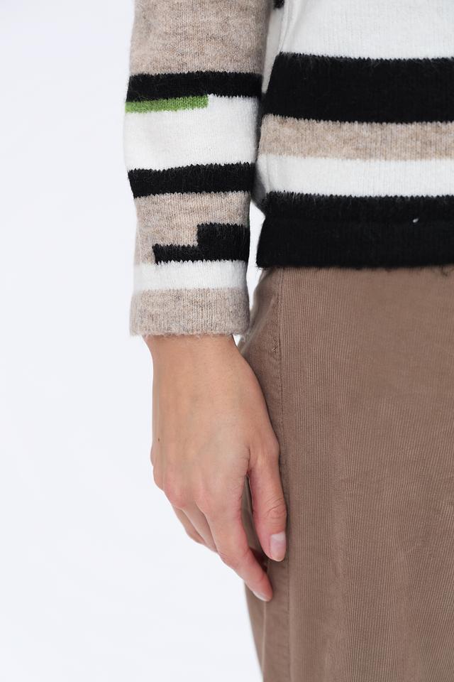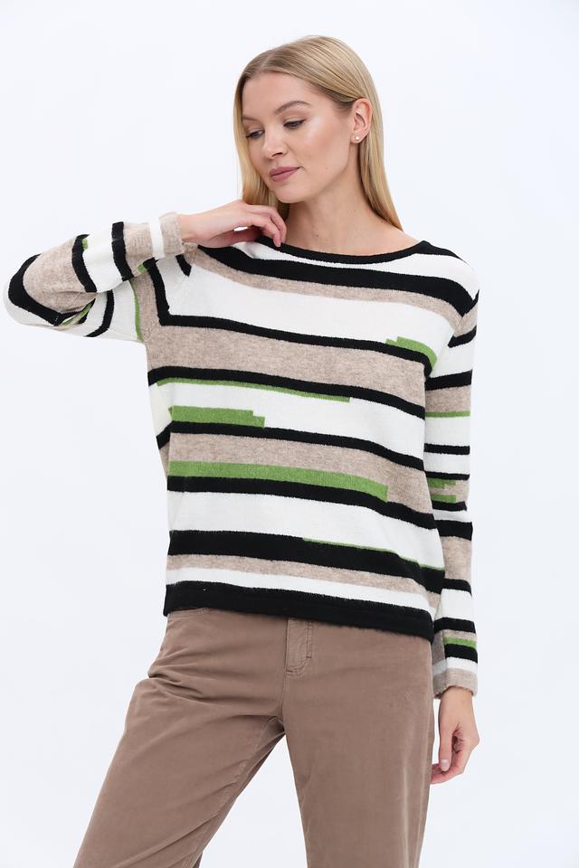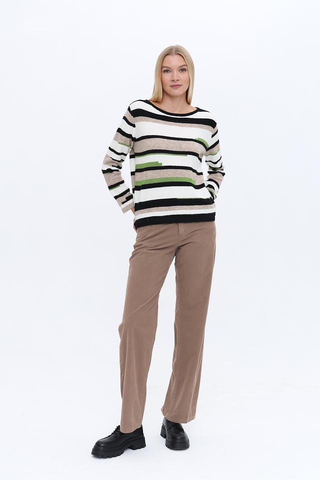 Этот стильный пуловер от Time Zone выполнен в актуальной полосатой расцветке, сочетающей в себе бежевые, белые, чёрные и зелёные оттенки. Он станет прекрасным выбором для создания повседневных образов.