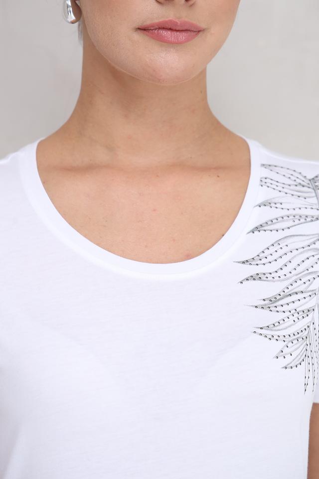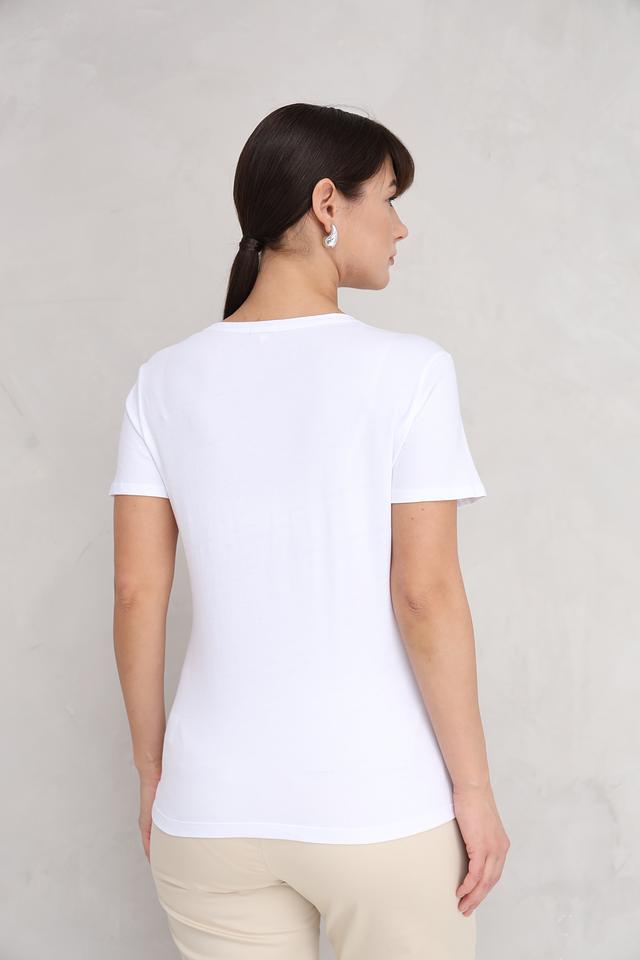 Футболка имеет классический крой с круглым вырезом горловины и короткими рукавами. Она идеально подходит для создания повседневных образов, сочетаясь с джинсами, шортами, юбками и другой одеждой. Благодаря своему лаконичному дизайну, эта футболка легко вписывается в любой стиль.