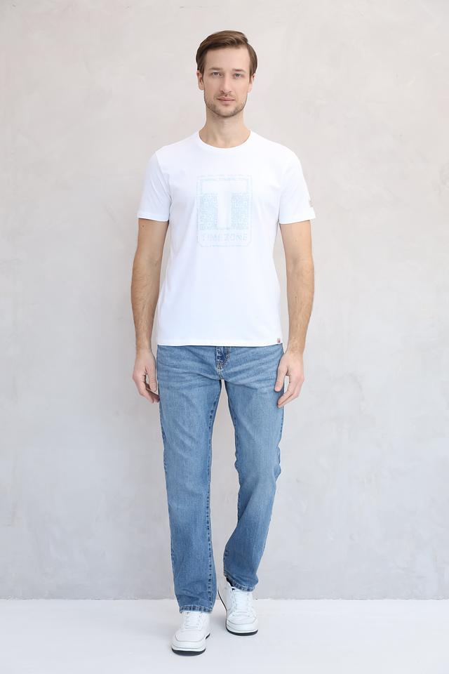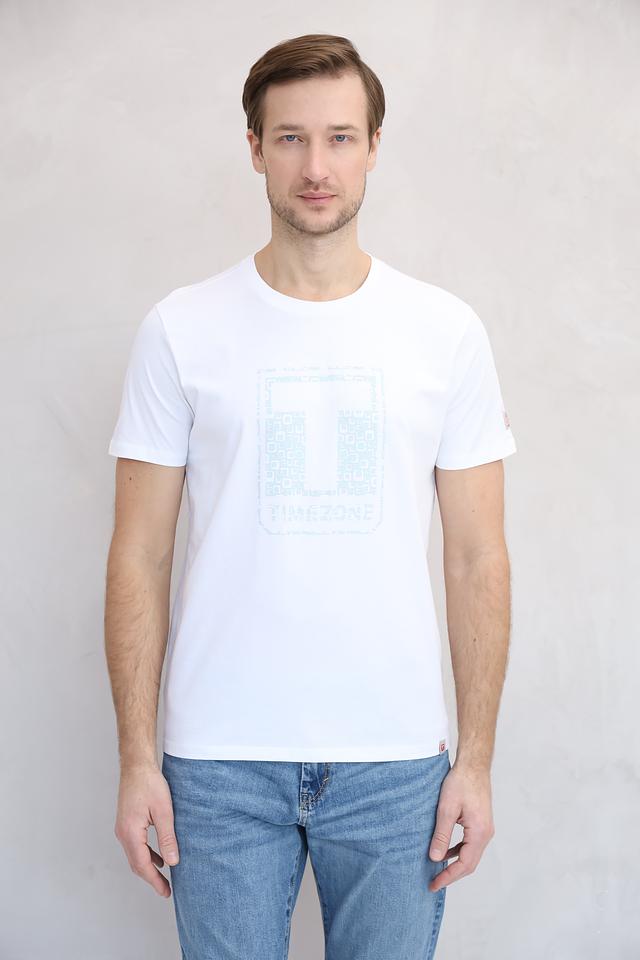 Белая футболка Time Zone с оригинальным принтом на груди. Изготовлена из 100% хлопка, обеспечивающего комфорт и воздухопроницаемость. Стильный и универсальный вариант для повседневного образа. Состав: хлопок 100%