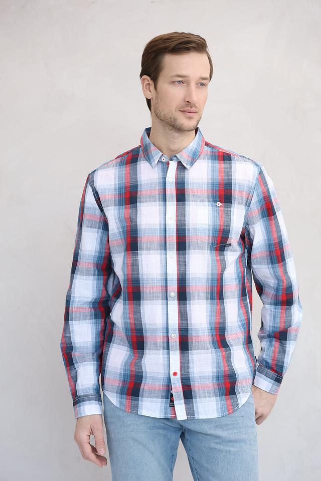 Рубашка выполнена в классической клетке сине-красных оттенков, что делает ее универсальной и подходящей для различных образов. Она имеет стандартный крой, длинные рукава и воротник с пуговицами.