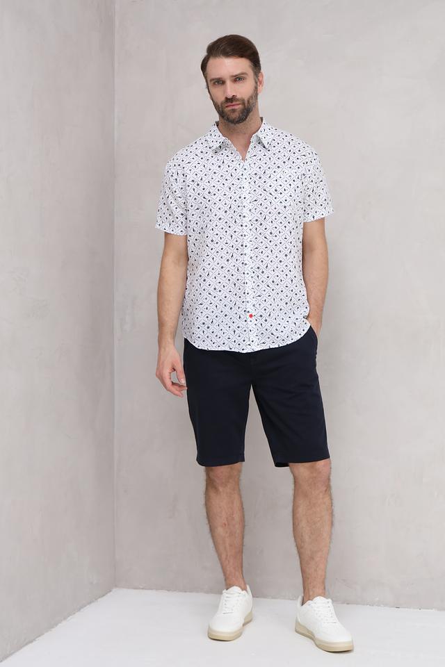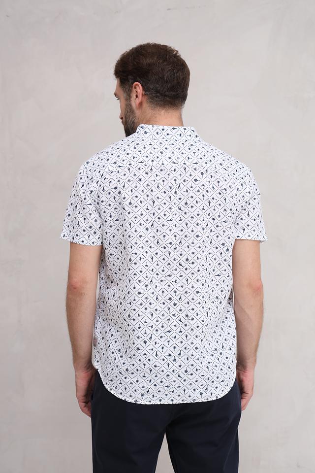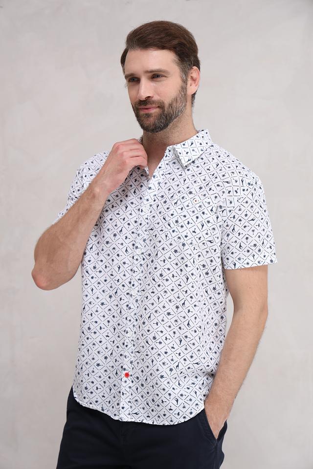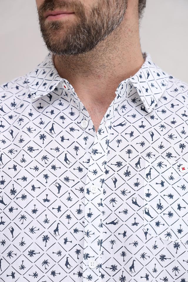 Мужская рубашка Time Zone белого цвета с оригинальным принтом в виде силуэтов животных. Модель с коротким рукавом выполнена из смесовой ткани на основе льна и хлопка, обеспечивающей комфорт в жаркую погоду. Состав: лен 55%, хлопок 45%