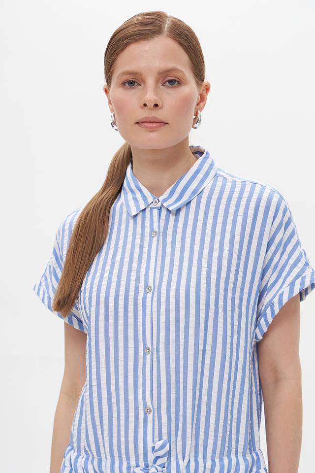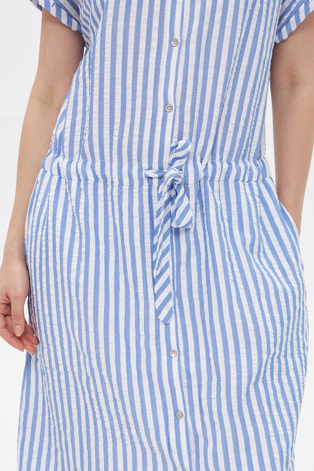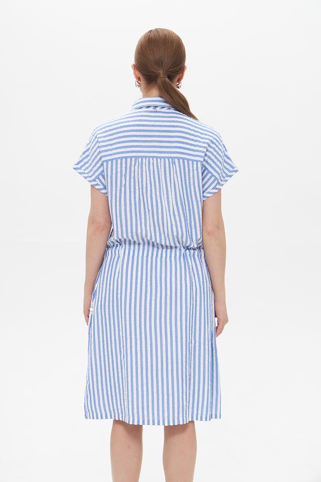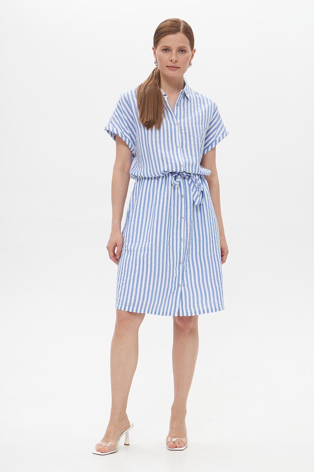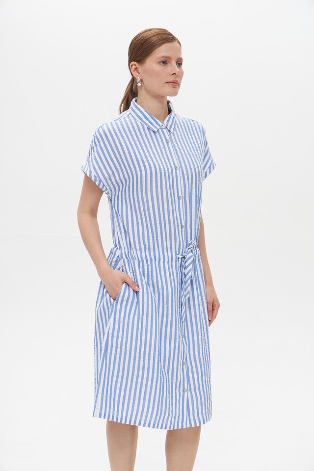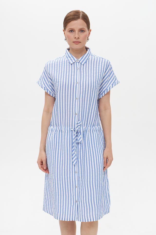 Платье Time Zone голубого цвета в белую полоску – это стильное и комфортное решение для повседневного образа. Модель выполнена из лёгкой ткани на основе вискозы и хлопка, имеет рубашечный крой и завязывающийся пояс. Состав: вискоза 62%, хлопок 38%