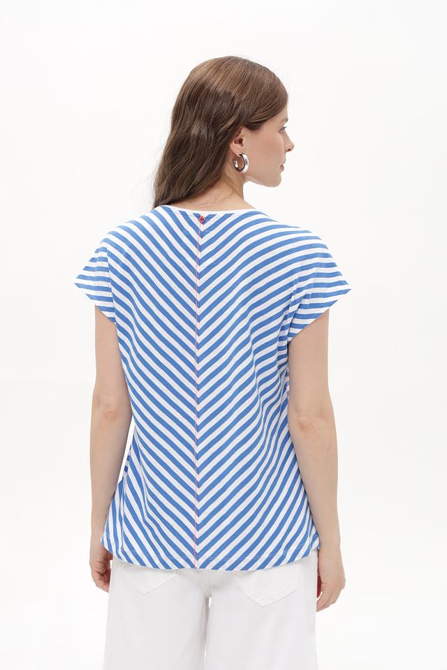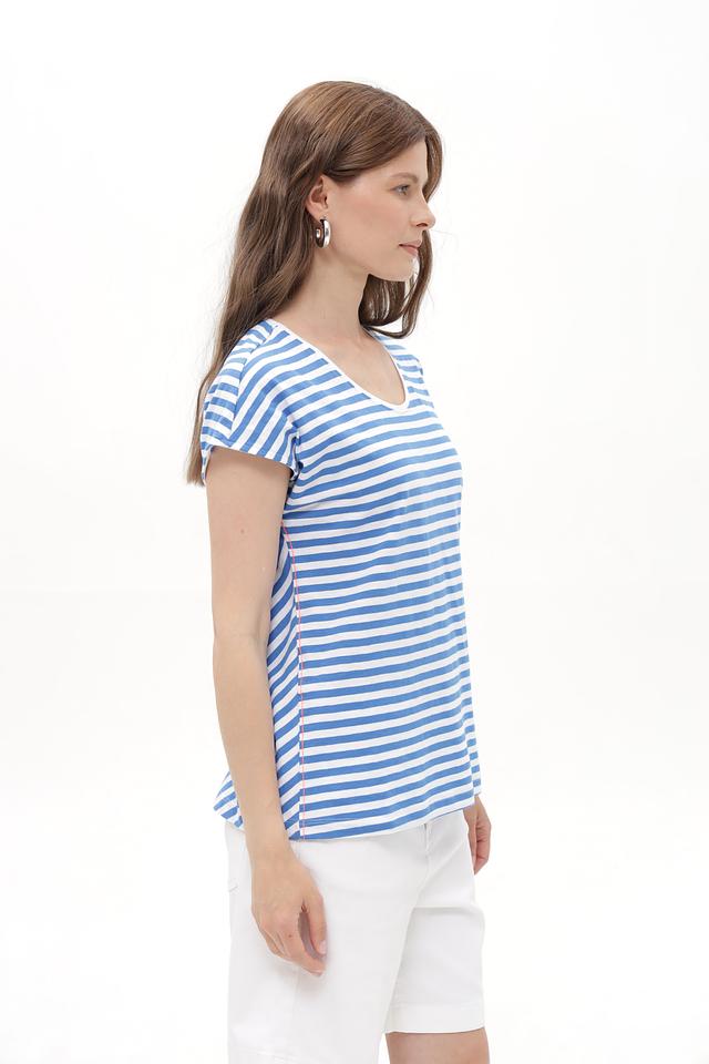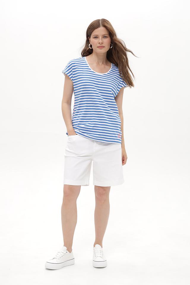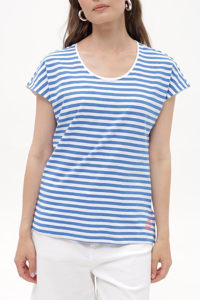 Женская футболка Time Zone голубого цвета в классическую полоску. Изготовлена из 100% хлопка, обеспечивающего комфорт и воздухопроницаемость. Отличный выбор для повседневного образа. Состав: хлопок 100%