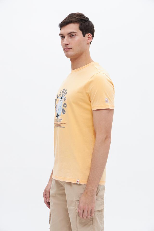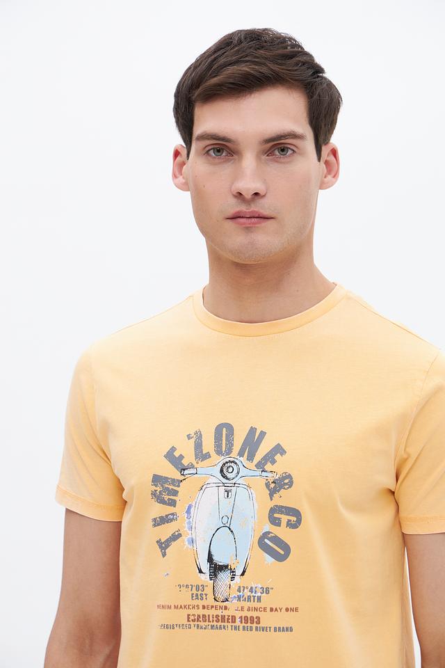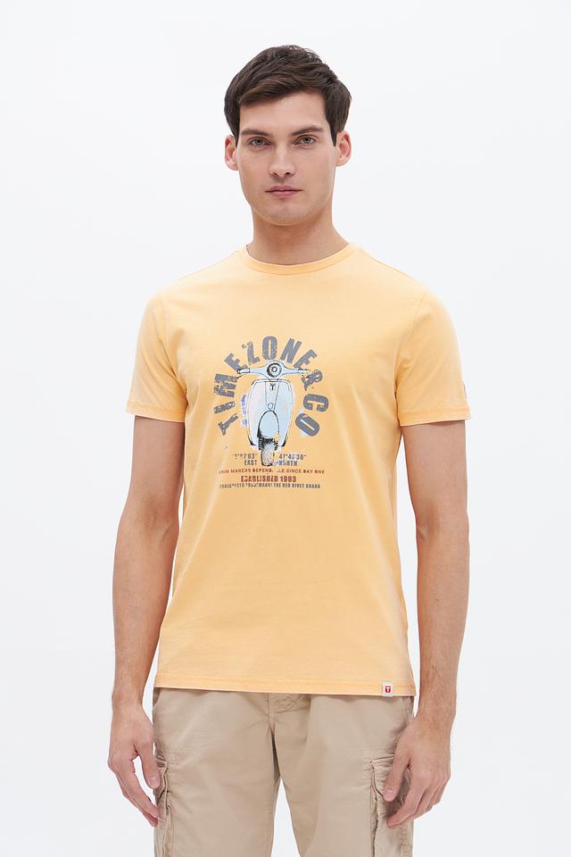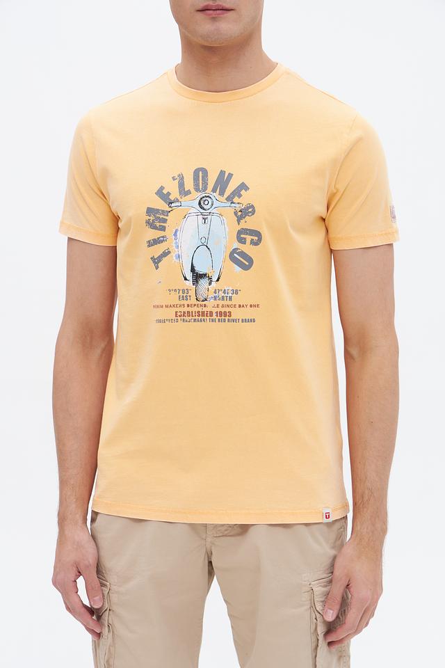 Эта футболка от Time Zone станет отличным дополнением к вашему гардеробу. Выполнена в светло-жёлтом цвете и украшена оригинальным принтом с изображением скутера и надписями.