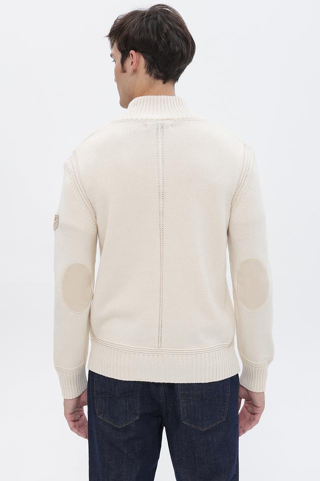Джемпер имеет классический крой с коротким воротником и молнией, что придает ему современный вид. На левой стороне груди расположен небольшой логотип бренда. Рельефная вязка на плечах и манжетах добавляет текстуры и визуального интереса.