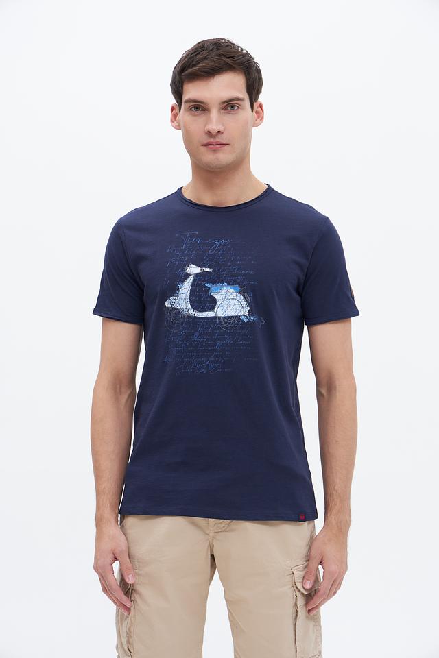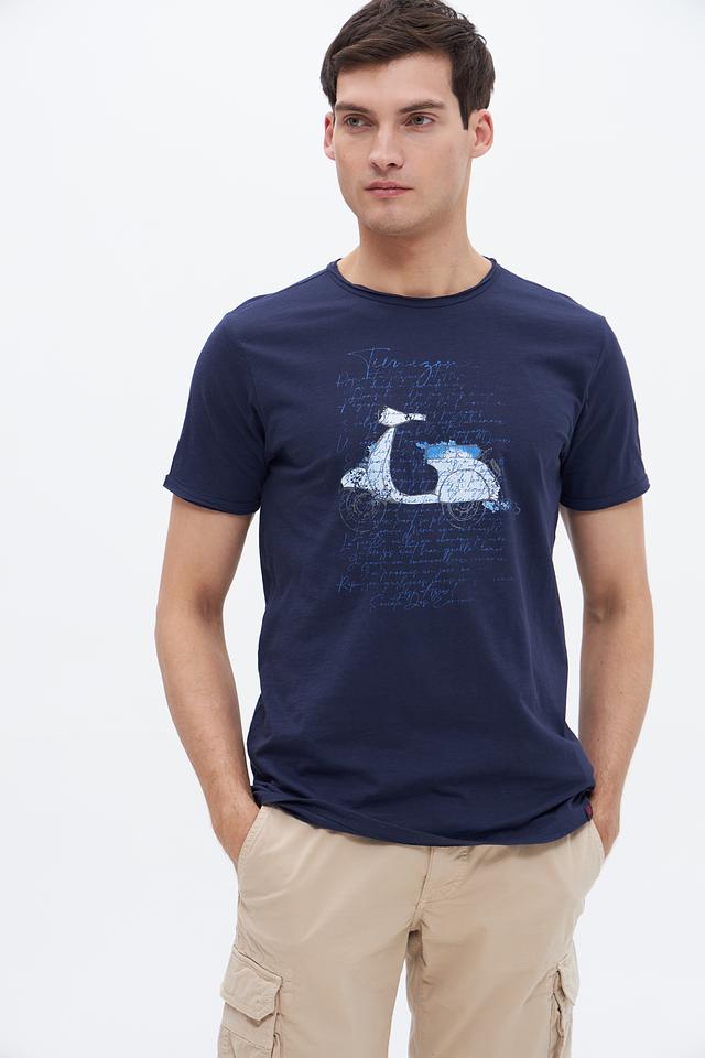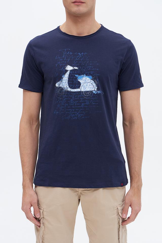 Мужская футболка Time Zone темно-синего цвета с оригинальным принтом в виде мотороллера. Изготовлена из 100% хлопка, обеспечивающего комфорт и воздухопроницаемость. Состав: хлопок 100%