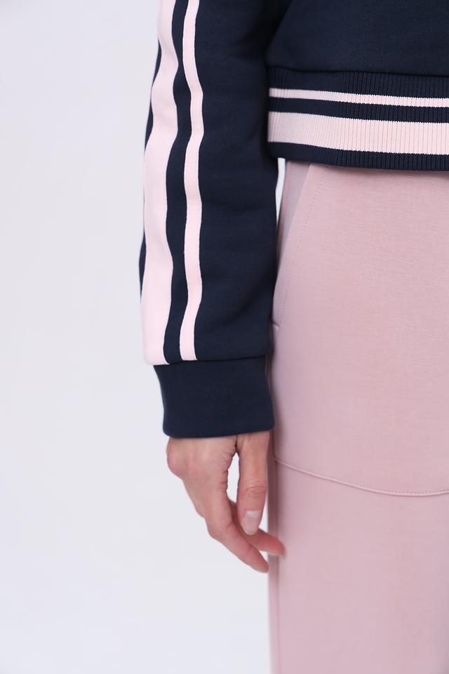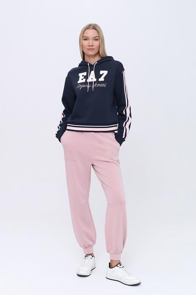 Основным акцентом является крупный логотип EA7, выполненный в белом и золотистом цвете, который придает толстовке узнаваемый и современный вид. По бокам рукавов расположены контрастные полосы в розовом и белом цвете, добавляющие динамичности образу.