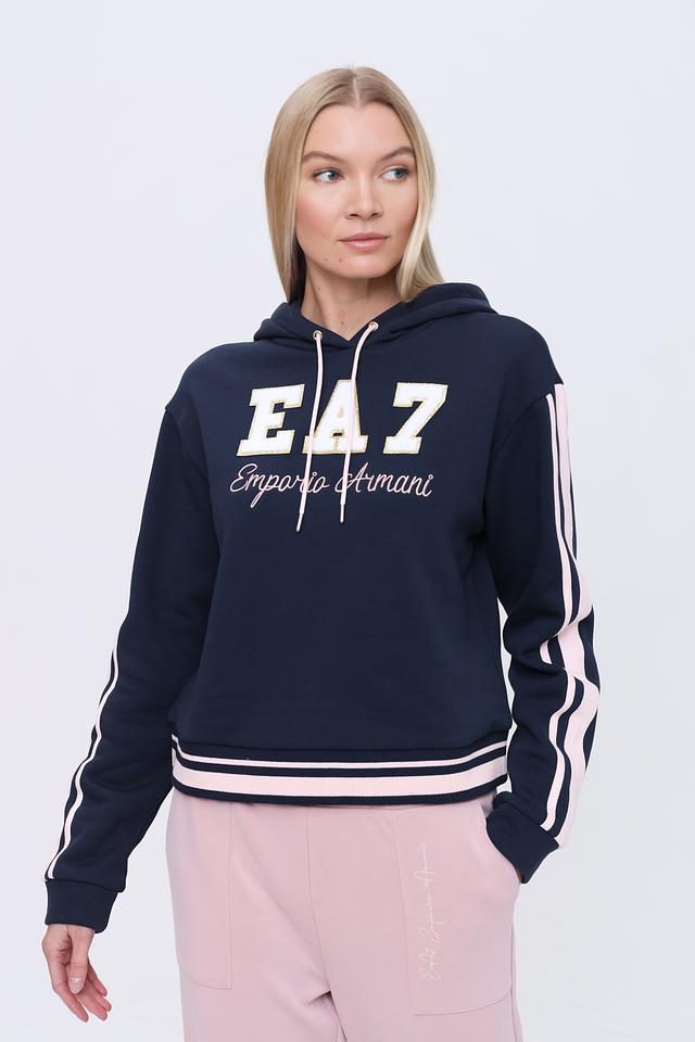 Женская толстовка EA7 темно-синего цвета с крупным логотипом и контрастными полосами на рукавах. Модель выполнена из мягкого хлопка с добавлением полиэстера для комфорта и долговечности. Состав: Состав_подкладка хлопок 100%, хлопок 74%, полиэстер 26%