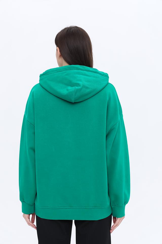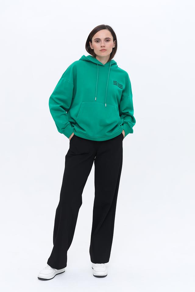 Толстовка имеет свободный, оверсайз крой, который позволяет создать расслабленный и современный образ. Капюшон и карман-кенгуру добавляют функциональности и практичности.