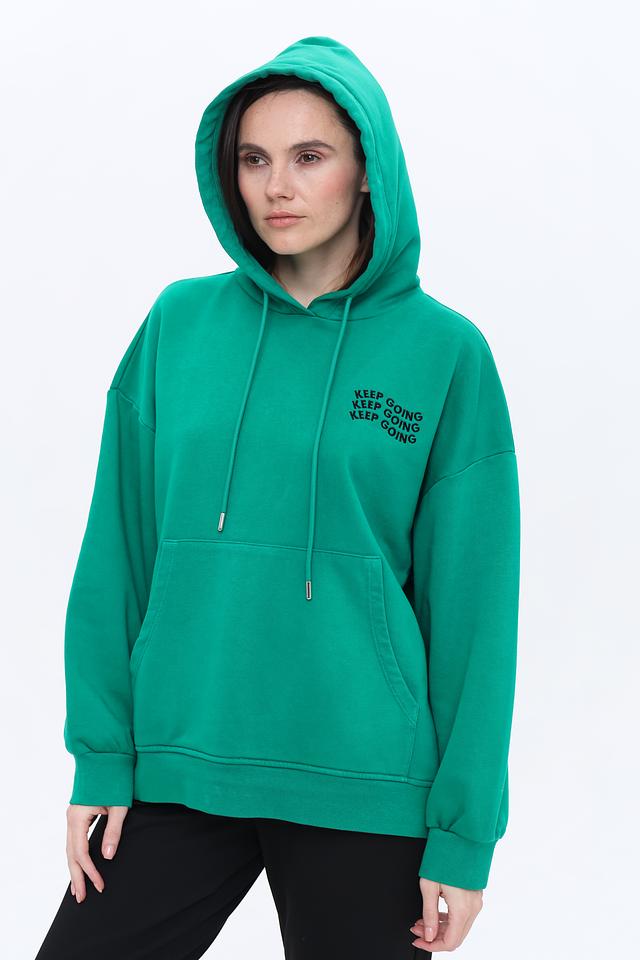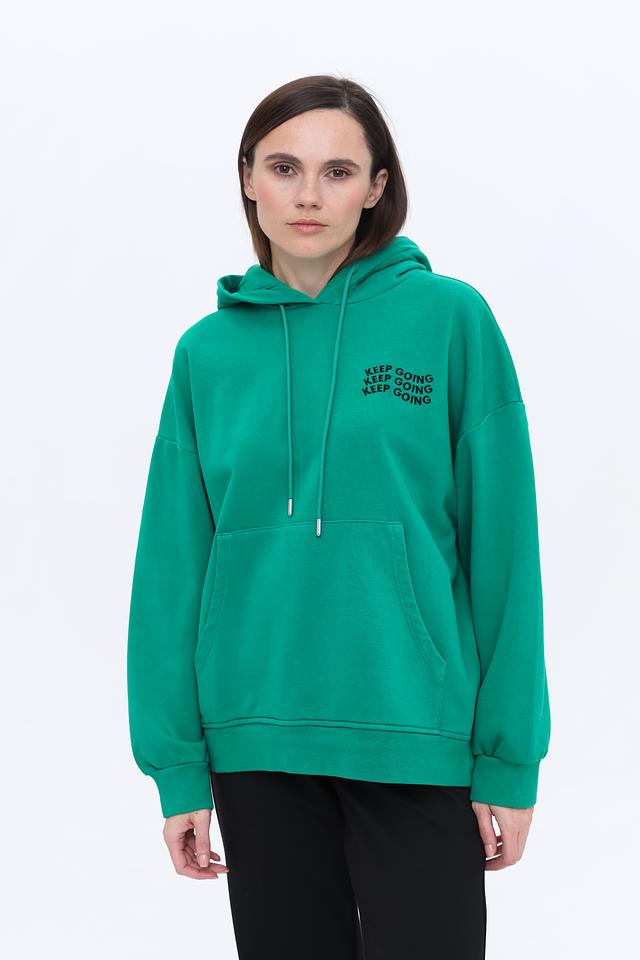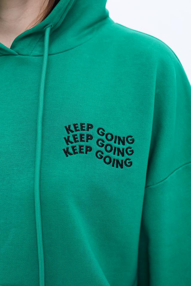 Передняя часть толстовки украшена надписью "KEEP GOING", выполненной в чёрном цвете, что придает ей индивидуальность и динамичный вид. Эта модель идеально подходит для создания повседневных образов, а также для активного отдыха.