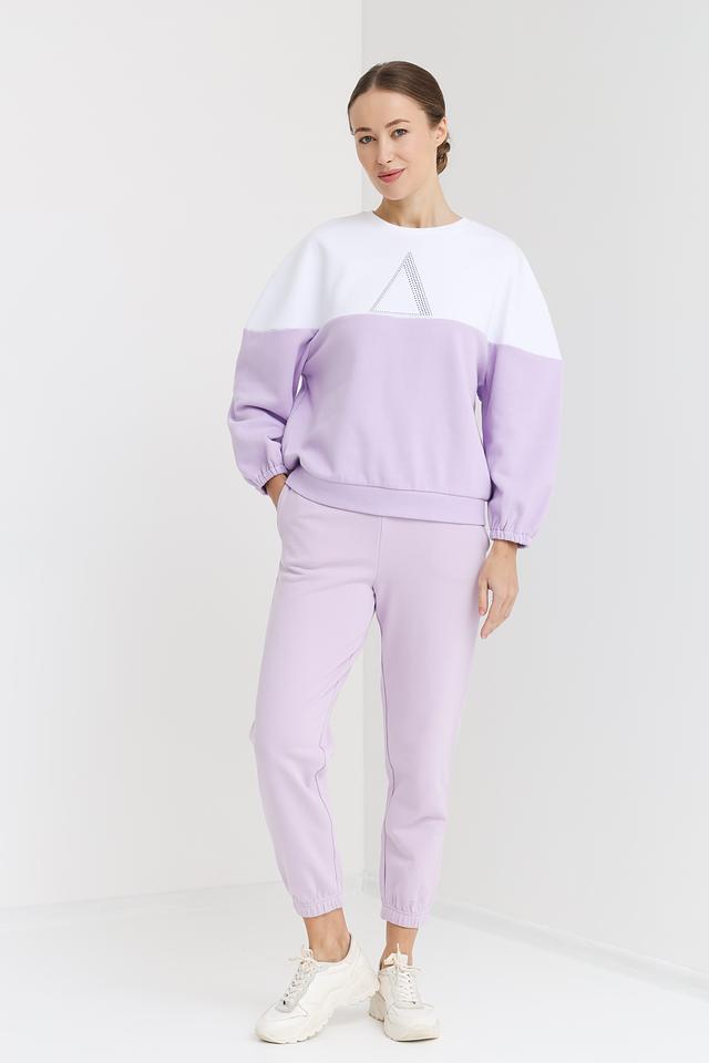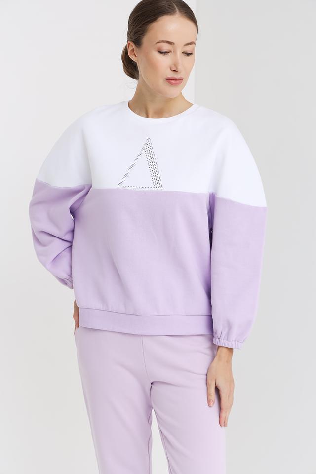 Эта женская толстовка от Pezzo сочетает в себе комфорт и стиль. Модель выполнена в двухцветной гамме: лавандовый и белый, что придает ей современный вид. Передняя часть толстовки украшена треугольным элементом, инкрустированным стразами, добавляющим изысканности.