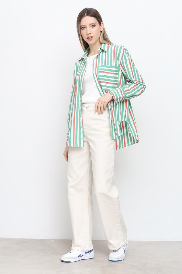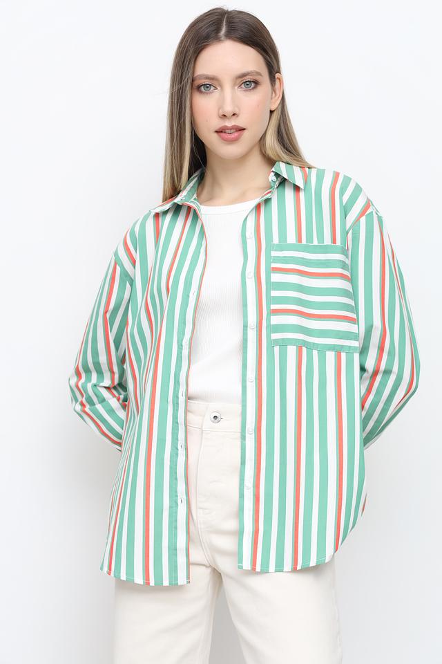 Женская рубашка Tom Tailor зеленого цвета в полоску с длинным рукавом. Стильная модель свободного кроя с накладным карманом добавит легкости вашему образу. Состав: хлопок 69%, полиамид 26%, эластан 5%