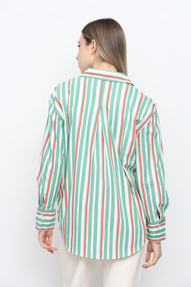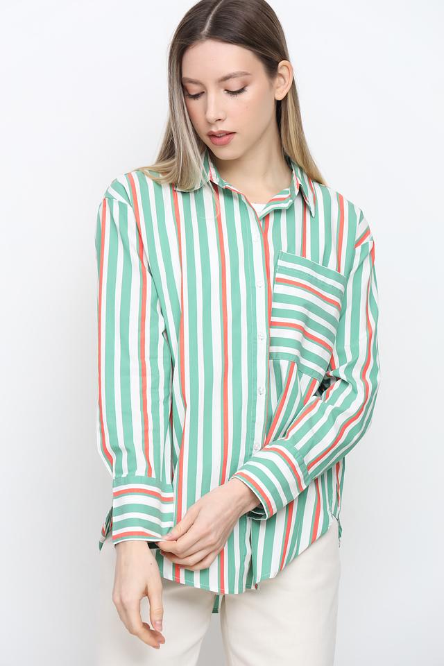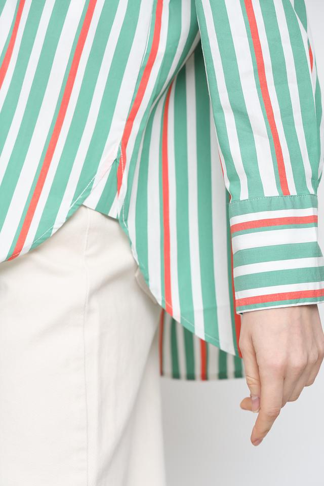 Эта рубашка от Tom Tailor станет отличным дополнением к вашему гардеробу. Выполнена в яркой полосатой расцветке, сочетающей в себе оттенки зеленого, белого и оранжевого.