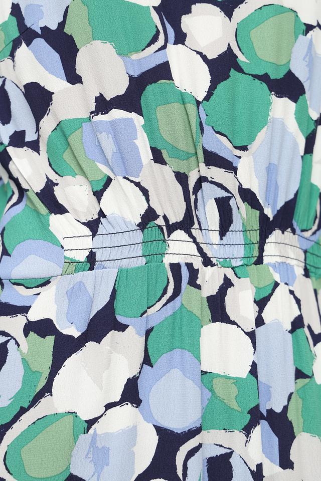 Особенностью этого платья является яркий и оригинальный цветочный принт, выполненный в сочетании синего, зелёного и голубого цветов. Это делает платье особенно привлекательным и позволяет создать яркий и запоминающийся образ. Платье идеально подходит для прогулок, встреч с друзьями или работы.
