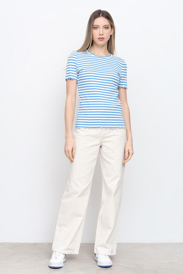 Футболка имеет классический крой и короткие рукава с декоративной оборкой. Голубая полоска придает ей свежий и летний вид. Отделка края в виде рюши добавляет изысканности и женственности.