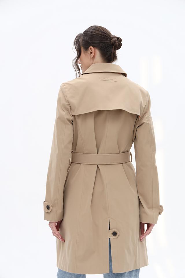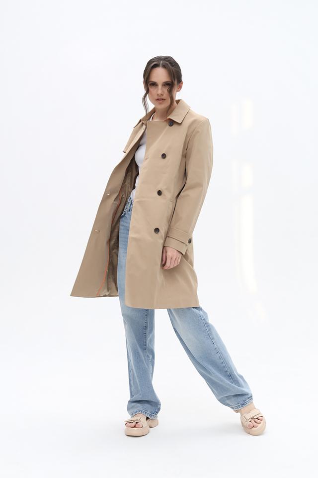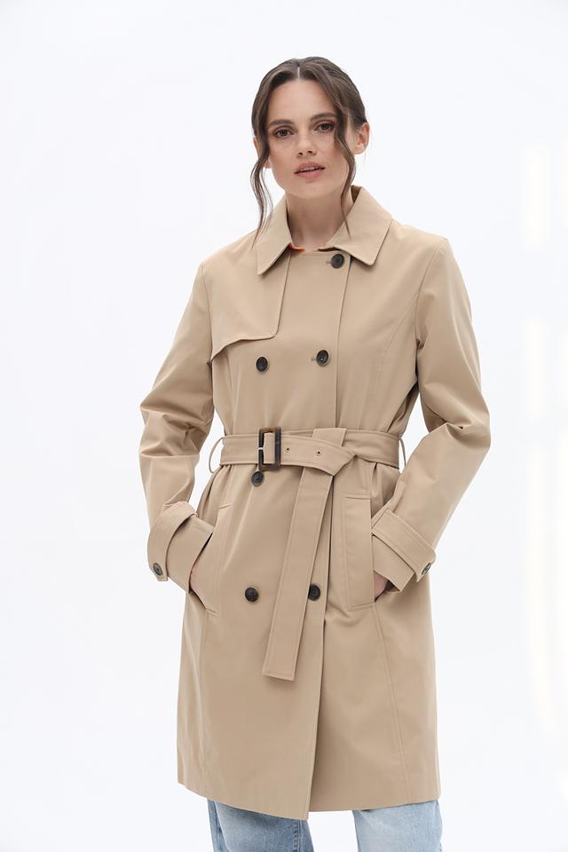 Плащ имеет двубортный крой с широким поясом, который позволяет регулировать силуэт и подчеркнуть талию. Застёжка на пуговицах обеспечивает надёжную фиксацию, а отложной воротник добавляет элегантности.