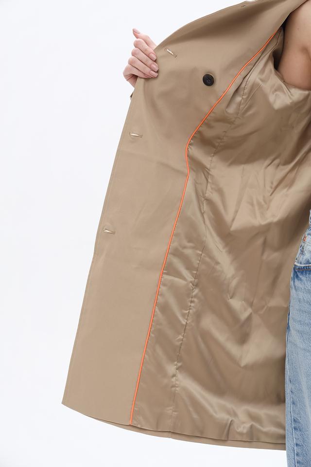 Изготовленный из 100% полиэстера, плащ отличается практичностью и простотой в уходе. Он устойчив к влаге и ветру, что делает его идеальным для повседневной носки. Подкладка плаща выполнена в оранжевом цвете, что добавляет интересный акцент.