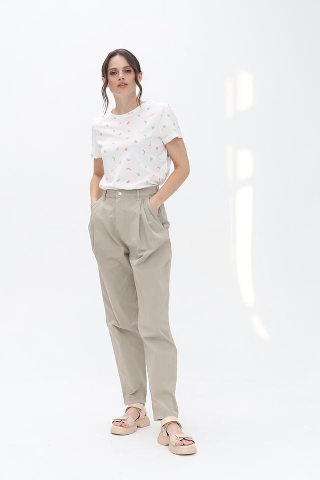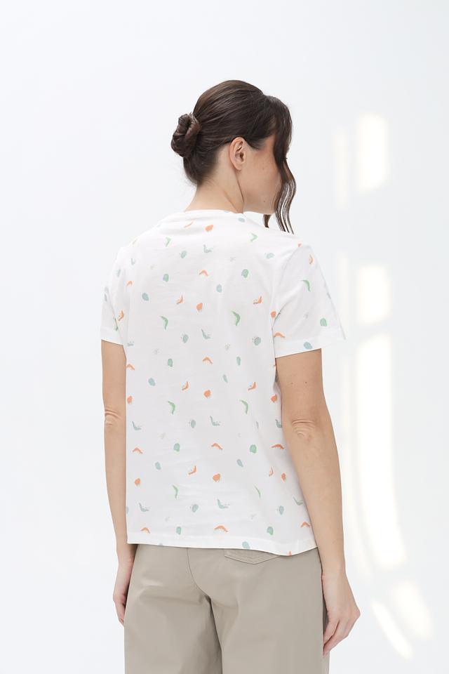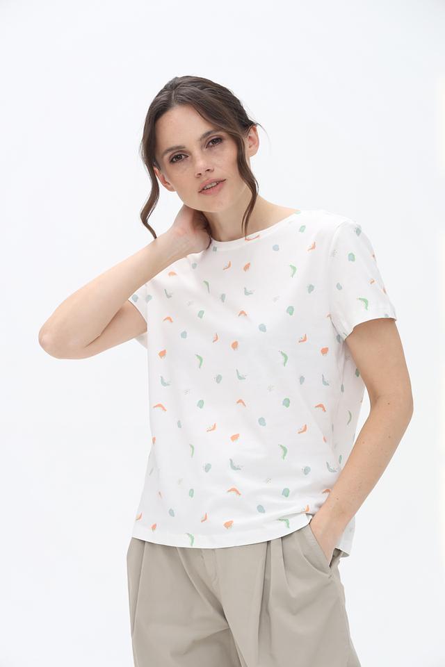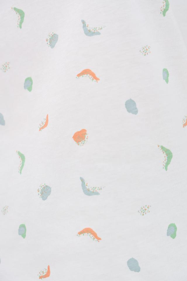 Основной цвет футболки – белый, а ярким акцентом служит оригинальный принт, состоящий из абстрактных фигур нежных оттенков: голубого, оранжевого и мятного. Круглый вырез горловины и короткие рукава делают эту модель идеальной для теплой погоды.