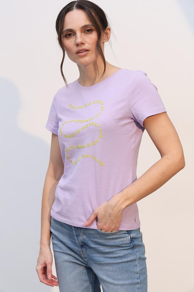 Женская футболка Tom Tailor denim лавандового цвета с оригинальным принтом. Изготовлена из 100% хлопка, обеспечивающего комфорт и воздухопроницаемость. Стильный и удобный вариант для повседневного образа. Состав: хлопок 100%
