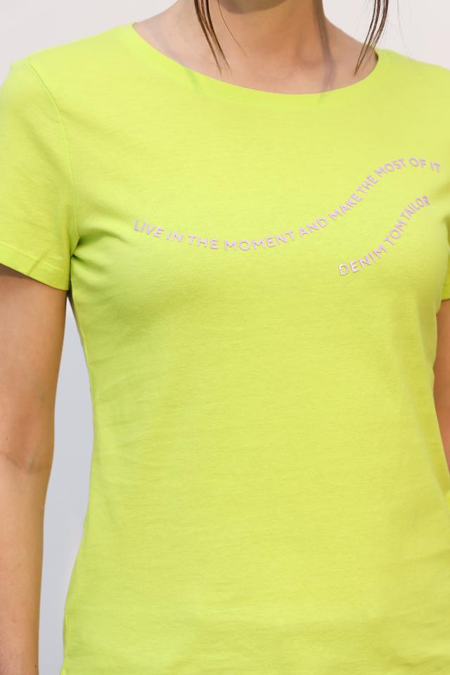 Женская футболка Tom Tailor denim girl лаймового цвета – это стильная и удобная модель из 100% хлопка. Футболка имеет прямой крой и короткие рукава, а также украшена надписью спереди. Идеальный выбор для повседневного образа. Состав: хлопок 100%