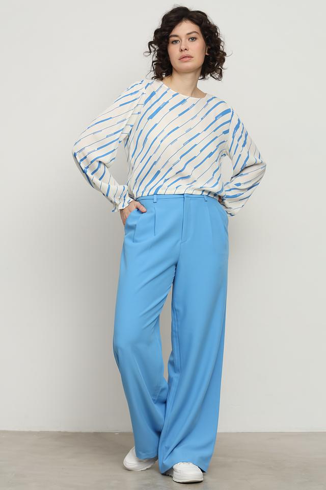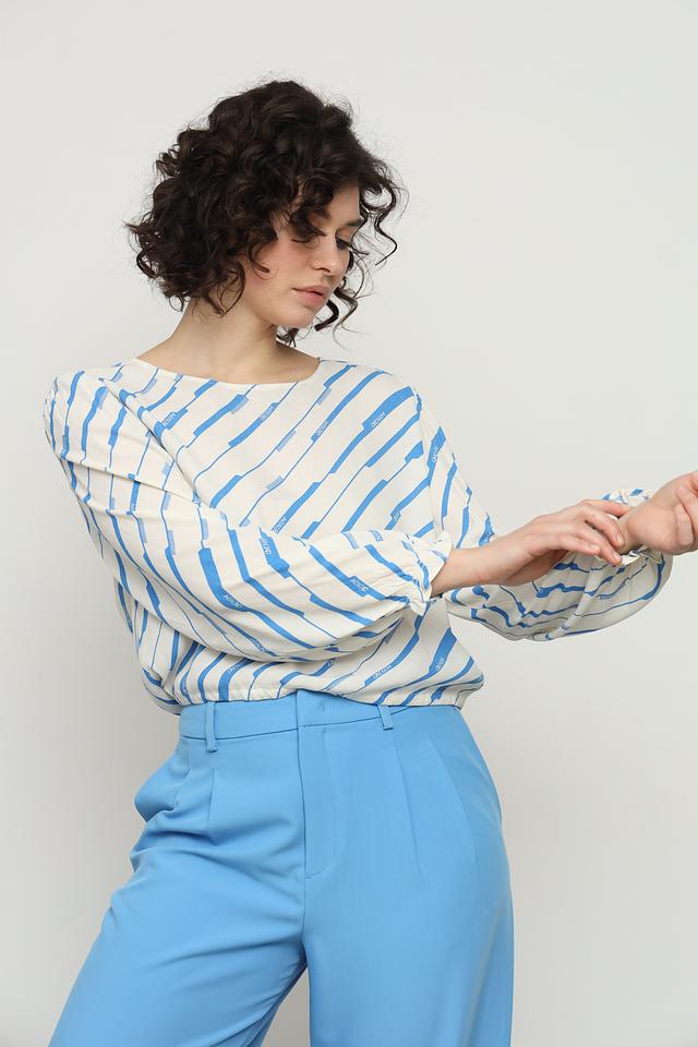 Особенностью модели является оригинальный полосатый принт, который добавляет динамики и индивидуальности. Блуза имеет свободный крой, который обеспечивает комфорт при носке. Длинные рукава с манжетами на резинке придают блузе аккуратный вид.