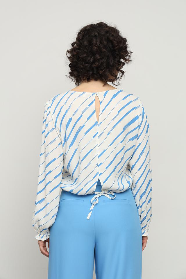 Блуза Tom Tailor голубого и белого цвета с оригинальным полосатым принтом. Модель выполнена из лёгкой вискозы, имеет длинные рукава с манжетами на резинке и завязки на спине. Состав: вискоза 100%