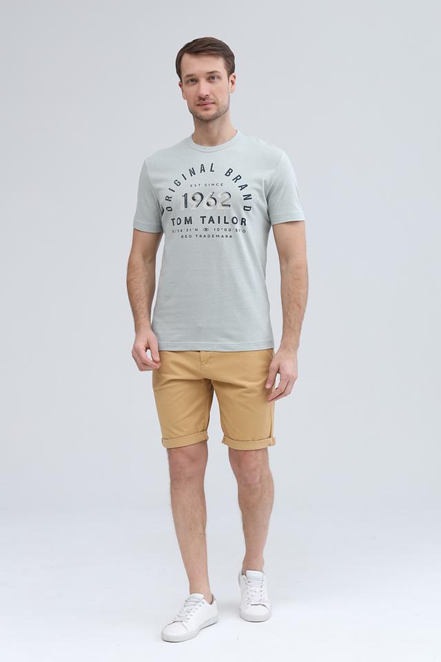 Основным элементом дизайна является крупный принт с логотипом бренда, выполненный в сером цвете. Принт включает в себя название бренда "Tom Tailor", год основания "1932" и географические координаты.