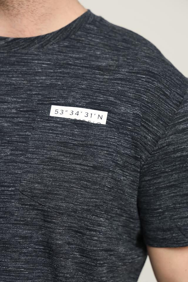 Модель имеет классический крой с короткими рукавами и круглым вырезом горловины. На груди расположена прямоугольная нашивка с белым принтом, содержащим географические координаты. Это придает футболке оригинальный и стильный вид.