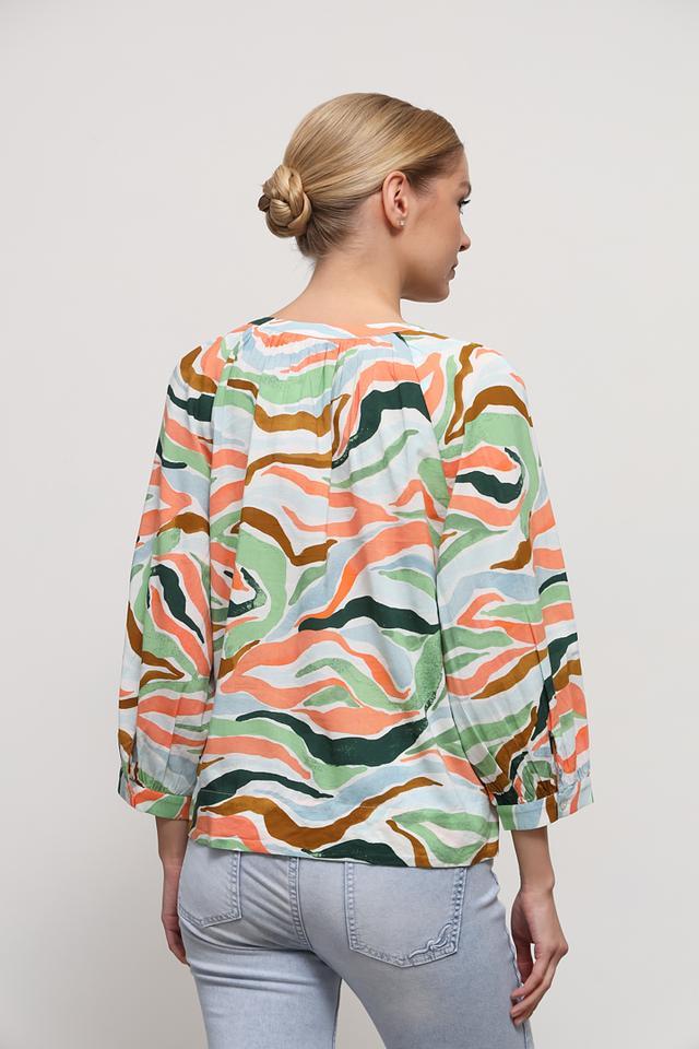 Блуза имеет свободный крой, V-образный вырез горловины и рукава длиной 3/4 с манжетами. Главная особенность модели – оригинальный абстрактный принт, выполненный в сочетании зелёных, оранжевых и голубых оттенков.
