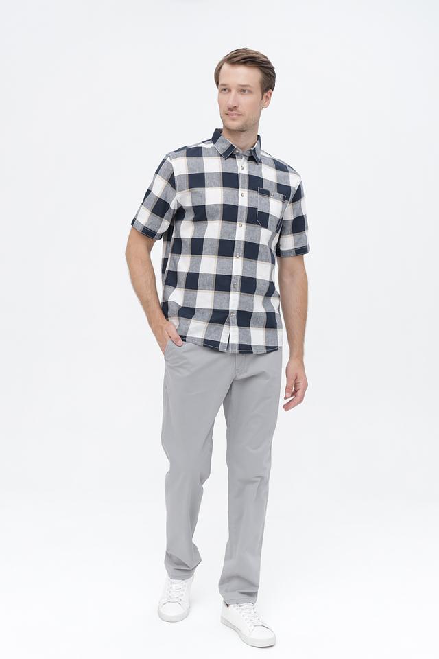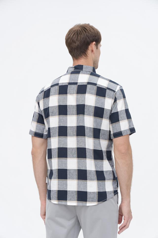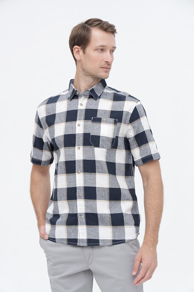 Мужская рубашка Tom Tailor синего цвета с коротким рукавом, выполнена в классической клетчатой расцветке. Изготовлена из натурального льна и хлопка, обеспечивающих комфорт и воздухопроницаемость. Состав: лен 55%, хлопок 45%