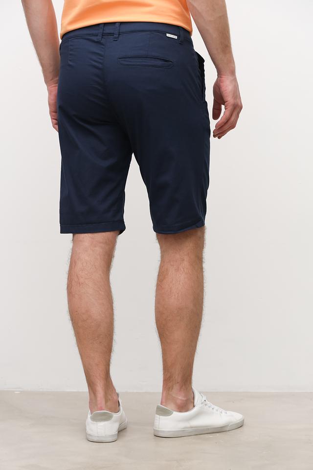 Цвет шорт – насыщенный темно-синий. На заднем кармане расположен небольшой логотип бренда. Шорты застегиваются на молнию и пуговицу. Боковые карманы удобны для хранения мелких предметов.