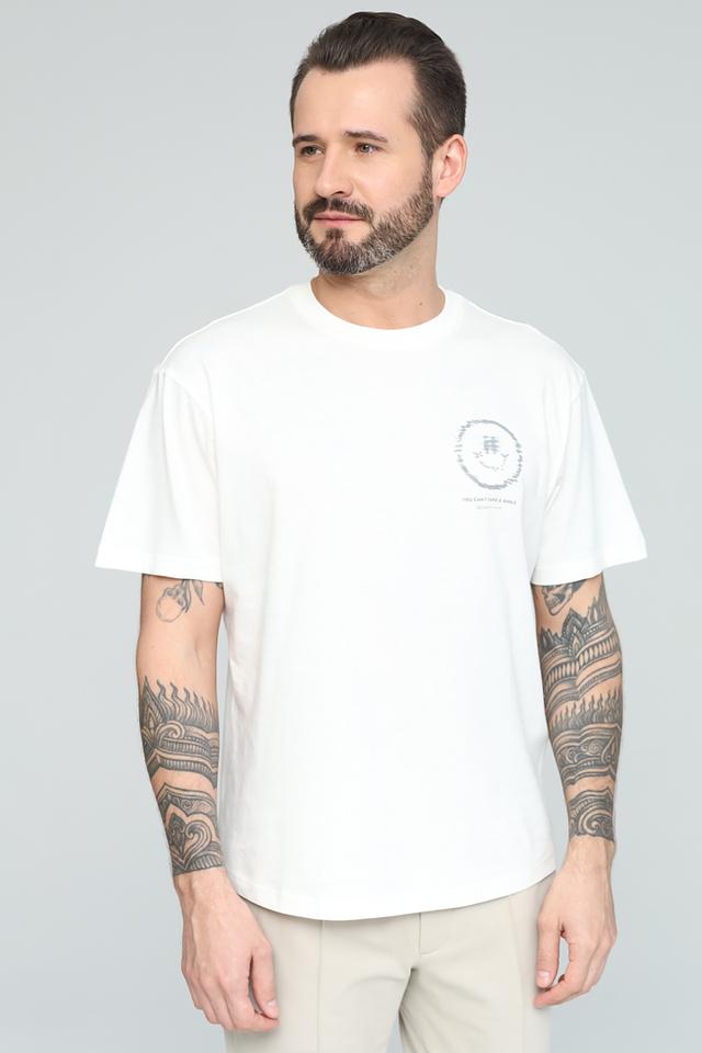 Модель имеет прямой крой и короткие рукава, что делает ее идеальной для теплой погоды. Футболка украшена оригинальным принтом с изображением смайлика и надписью "YOU CAN'T FAKE A SMILE" на груди и спине, выполненным в сером цвете.