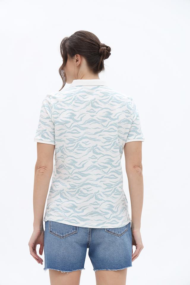 Это женское поло от бренда Tom Tailor, выполненное в светло-голубой цветовой гамме с необычным волнистым принтом, который придает изделию свежий и современный вид.