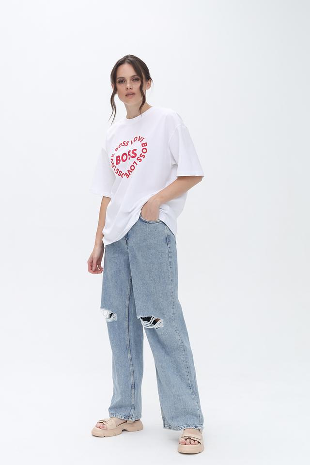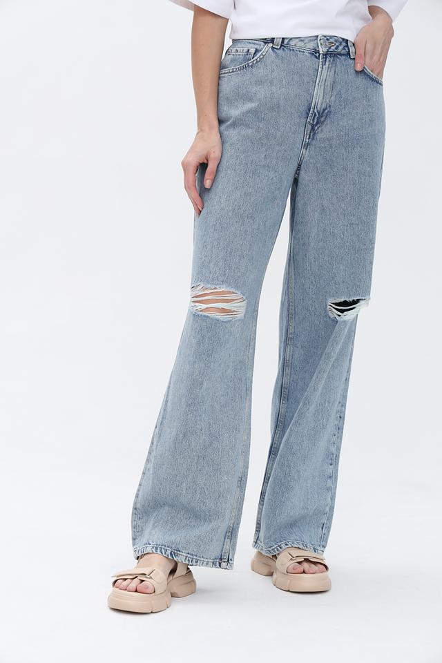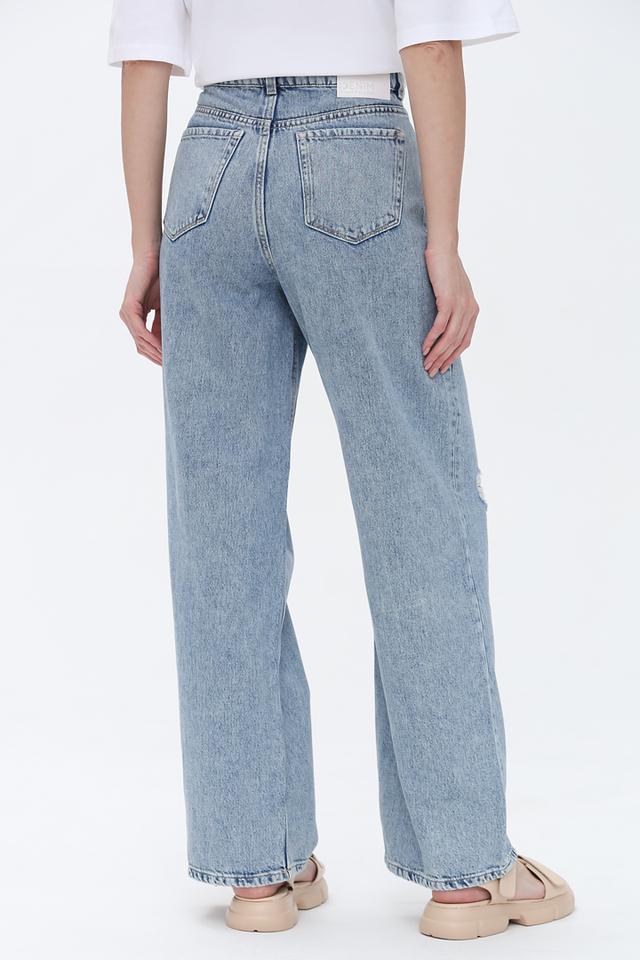 Джинсы имеют прямой крой и высокую посадку, обеспечивающие комфортную посадку по фигуре. Декоративные рваности на бедрах добавляют образу дерзости и оригинальности.