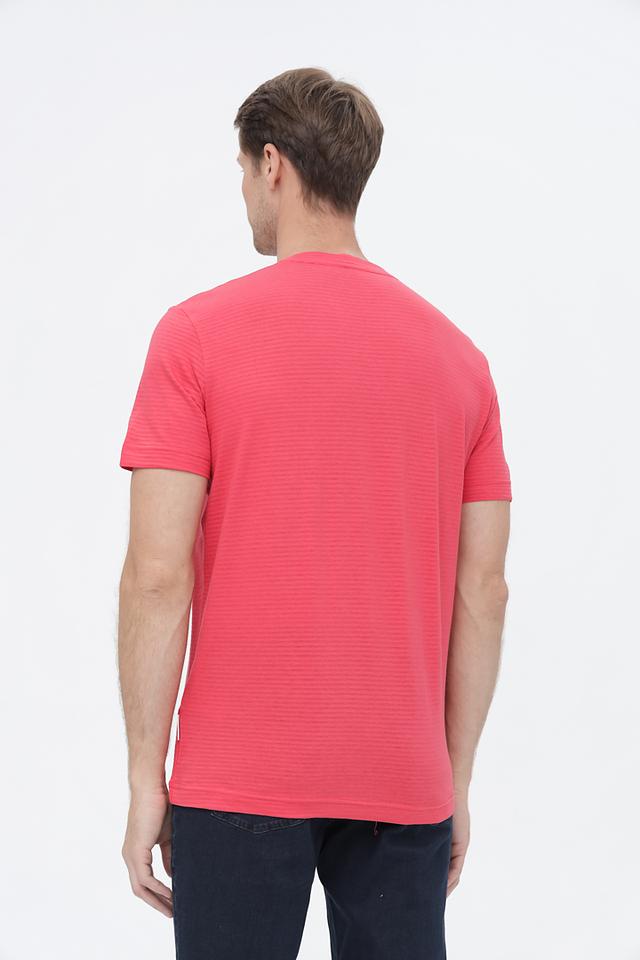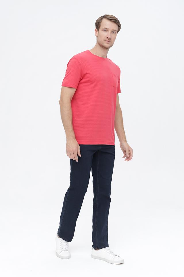 Модель изготовлена из 100% хлопка, что обеспечивает комфорт и воздухопроницаемость в течение всего дня. Текстурированная поверхность ткани придает футболке интересный вид. Классический крой обеспечивает свободу движений, а круглый вырез горловины и короткие рукава делают ее универсальной для любого случая.