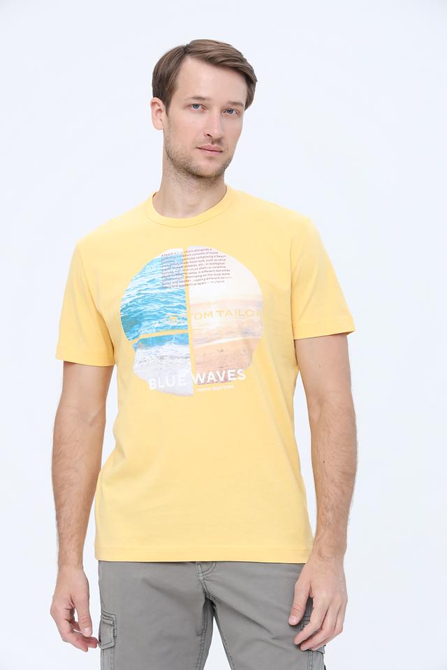 Мужская футболка Tom Tailor жёлтого цвета с ярким принтом "Blue Waves". Изготовлена из 100% хлопка, обеспечивающего комфорт и воздухопроницаемость. Стильный дизайн и удобный крой делают эту футболку отличным выбором для повседневной носки. Состав: хлопок 100%