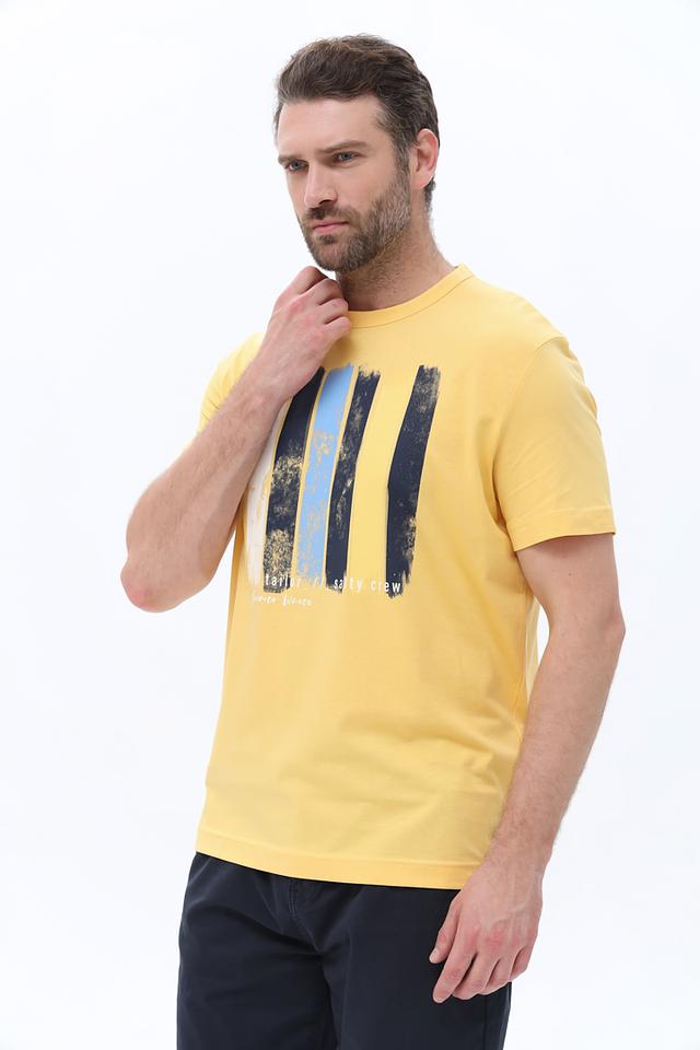 Дизайн футболки представлен в жёлтом цвете с вертикальными полосами, выполненными в сочетании синего, белого и серого цветов. Такое сочетание делает футболку яркой и привлекательной.