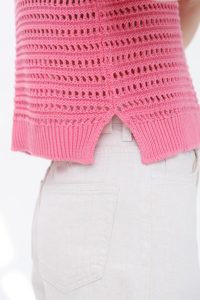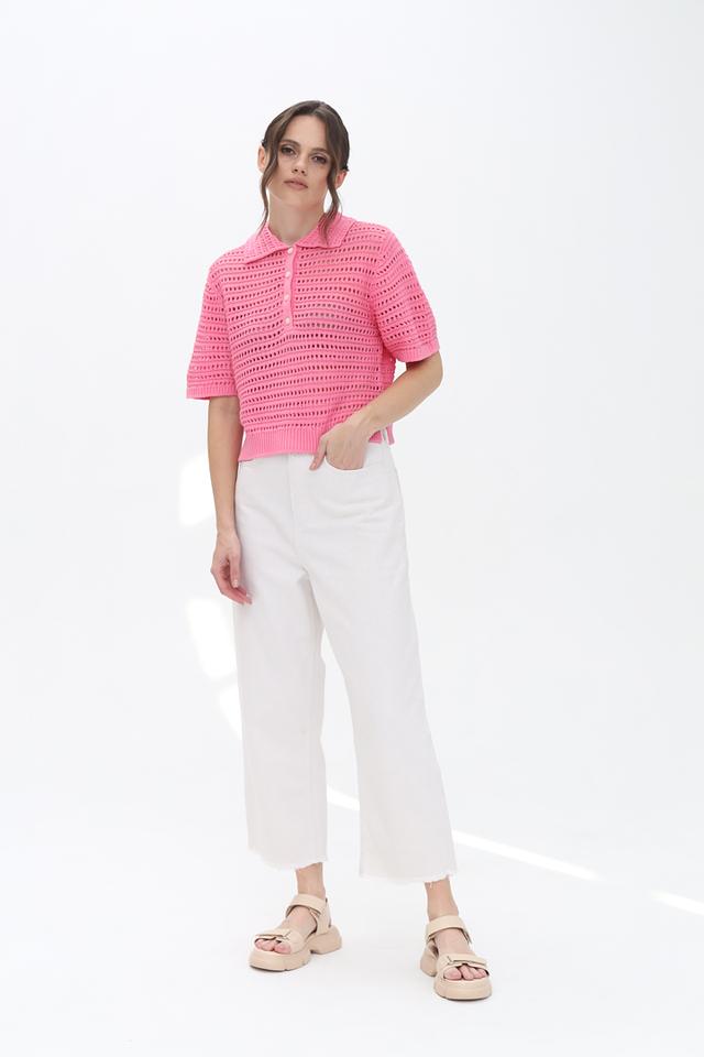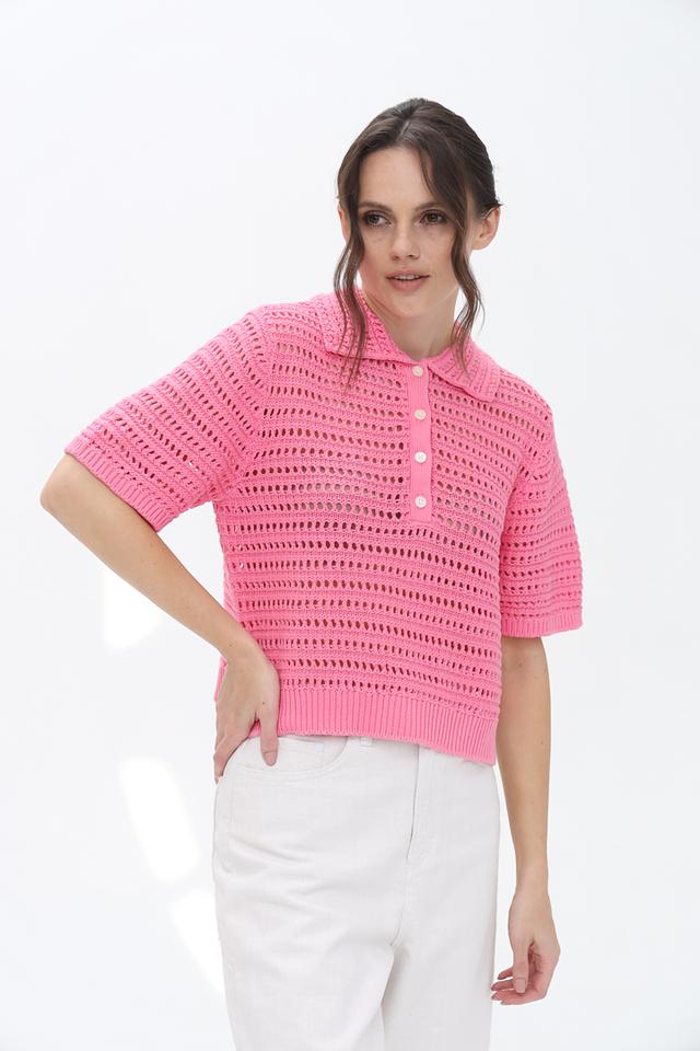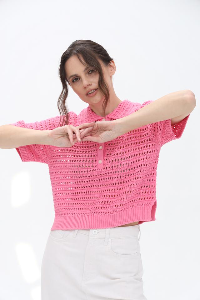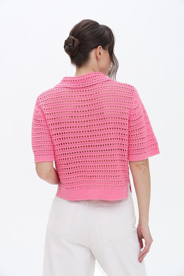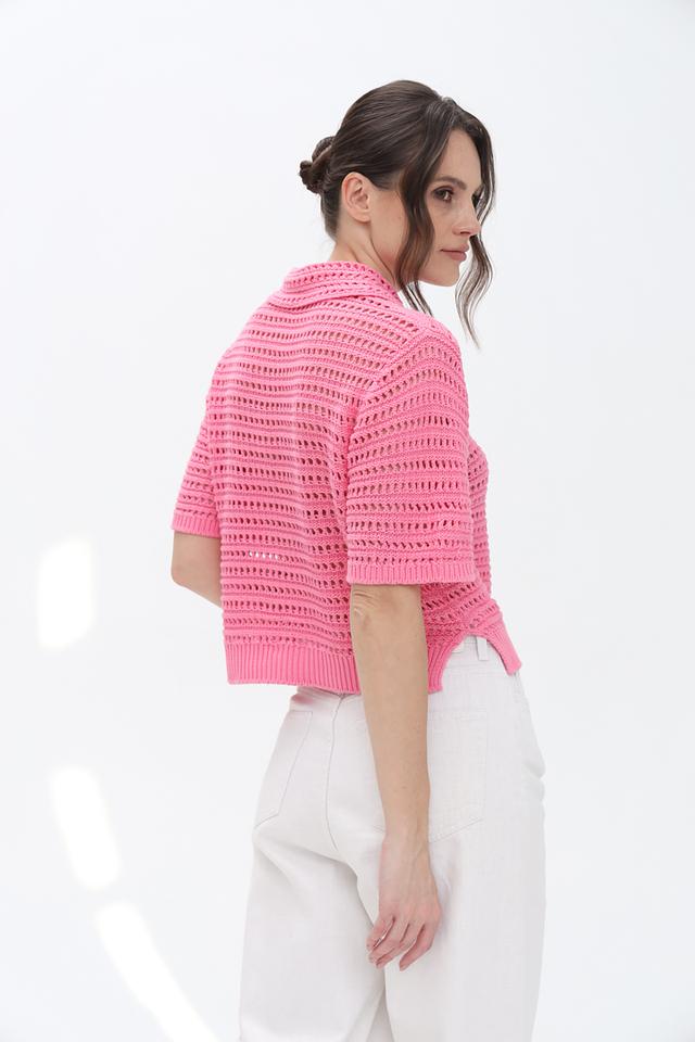 Яркий розовый цвет пуловера делает его отличным акцентом в гардеробе. Ажурное плетение придает модели легкость и воздушность. Удобный крой обеспечивает свободу движений.