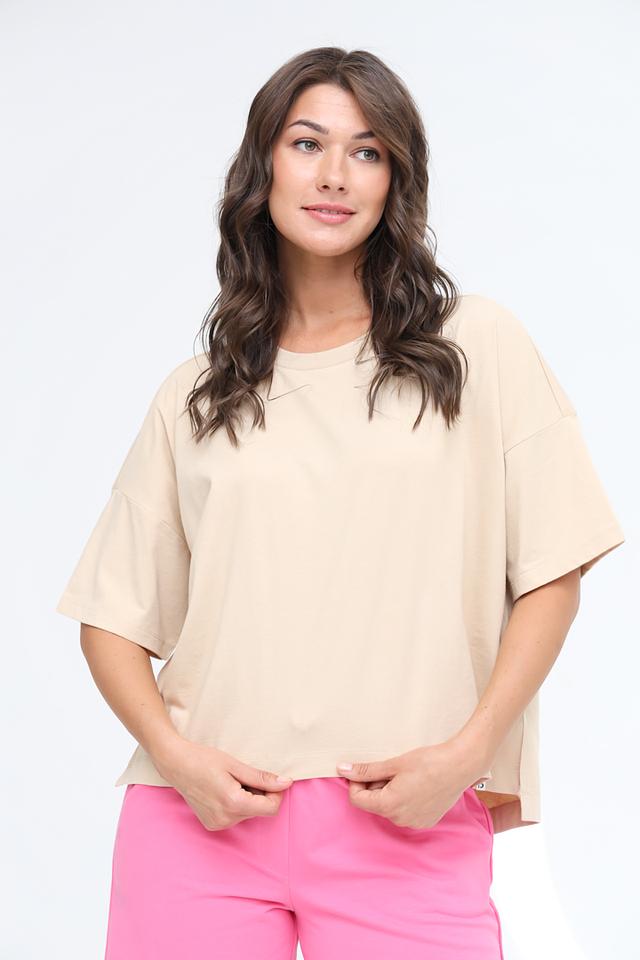 Особенностью данной модели является небольшой разрез по бокам, который добавляет ей современный и стильный вид. Эта футболка идеально подойдет для создания повседневных образов, сочетаясь с джинсами, шортами или юбками.
