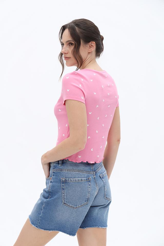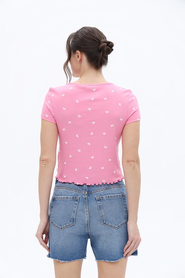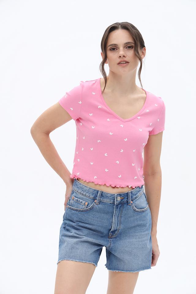 Розовая футболка Tom Tailor denim girl с короткими рукавами и V-образным вырезом. Модель украшена мелким принтом в виде бабочек и имеет оборку по нижнему краю, что придает ей лёгкий и романтичный вид. Состав: хлопок 93%, эластан 7%