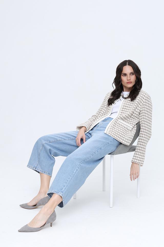 Джинсы характеризуются высокой посадкой, что подчеркивает талию и создает элегантный силуэт. Классический пятикарманный дизайн дополнен аккуратными швами и минималистичным декором.